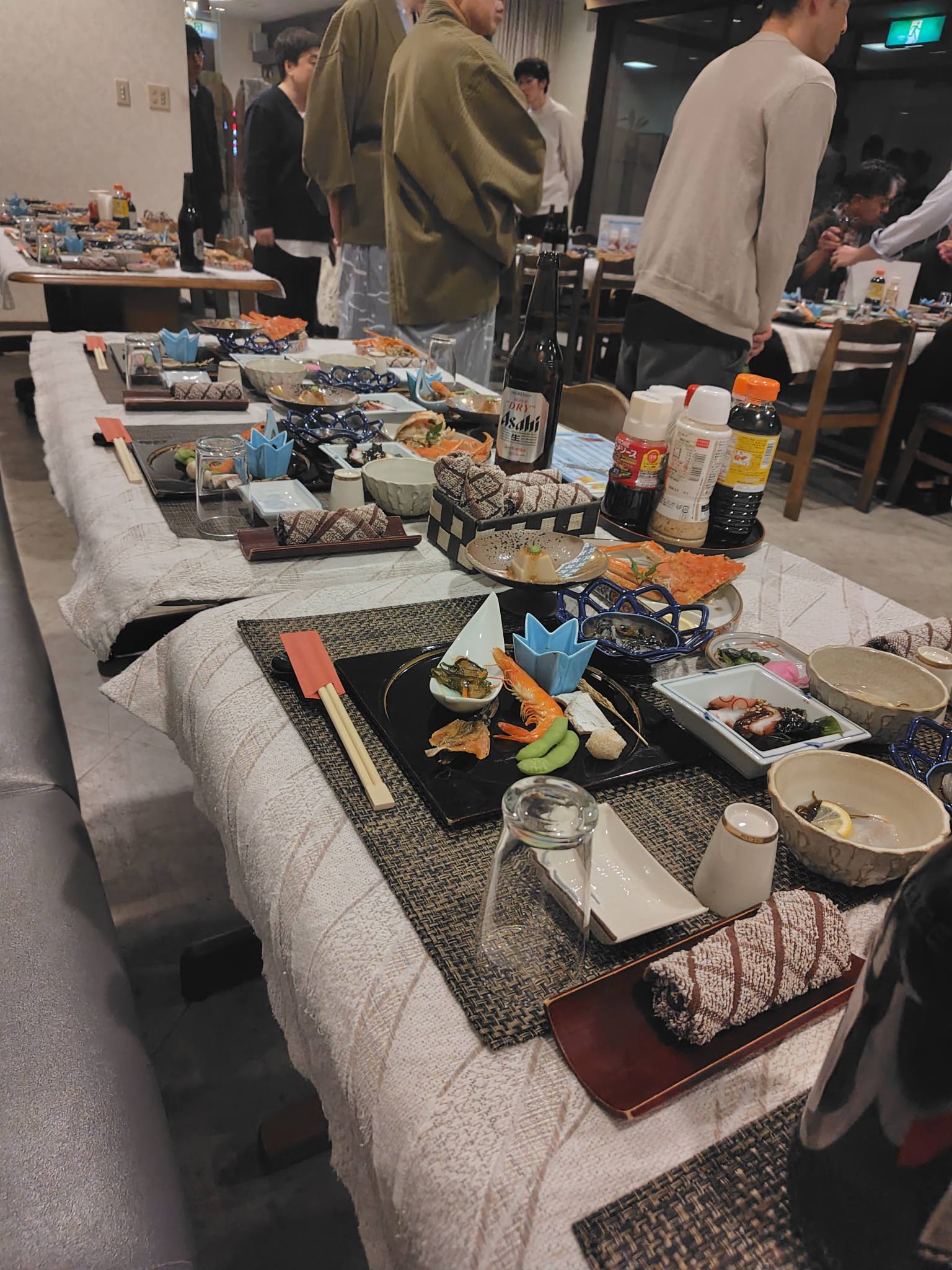 その後皆で温泉に入り、食事会。海が目の前の宿で、美味しい魚を」いただきました。各人地元の美味しいお酒を持ち寄り、全国各地の日本酒を楽しみました。