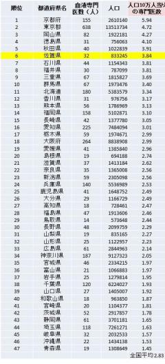 2015年度の人口当たりの血液専門医数を計算してみました(日本血液学会のホームページで公開されている各県の専門医数と2010年の国勢調査の各県の人数に基づいています)。