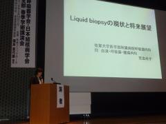 教育セミナーでは、当科の荒金尚子診療教授が「リキッドバイオプシーの現状と将来展望」について講演を行い、非小細胞肺がんの治療選択でのEGFR遺伝子検査において、当科で確立したMBP-QP法を含めたリキッドバイオプシーと組織生検に関して解説を行いました。