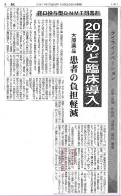 2017年10月25日発行の化学工業日報社に、大原薬品工業と行っている創薬プロジェクトに関する記事が掲載されました。
