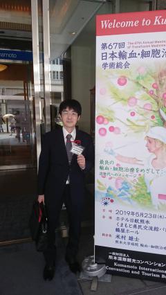 2019年5月23日~25日、熊本市で、第67回日本輸血・細胞治療学会学術総会が開催されました。当科からは、久保田寧先生、山口享祐先生が参加しました。また、検査部からは末岡榮三朗先生、山田尚友副検査技師長、山田麻里江技師、中尾真実技師も参加されました。