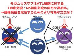 ATLは難治性造血器腫瘍の一つですが、臨床現場では2012年に大きな進展があり、新薬モガムリズマブが臨床現場で用いられるようになりました。本薬剤はATL細胞上のCCR4という蛋白質に作用するモノクローナル抗体ですが、制御性T細胞上のCCR4にも作用し、その結果T細胞およびNK細胞の両方を介した抗腫瘍免疫を強化することが分かってきました。振り返ればこれまでの経験から、ATLでは同種造血幹細胞移植による抗腫瘍免疫がよく奏功することが知られています。現在はモガムリズマブのT細胞およびNK細胞免疫への作用やその治療効果を決定する因子、さらにはHTLV-1感染からATL発症に至るまでのホスト免疫の関与につき、さまざまな免疫学的解析を行っています。究極的にはモガムリズマブのより効果的な投与法および、抗腫瘍免疫を最大限利用したATLに対するより優れた同種移植法の開発を目指しています。