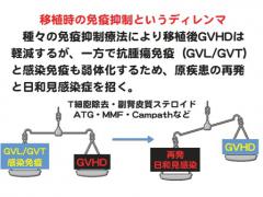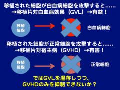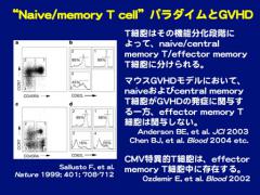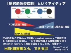 難治性の血液疾患において、同種造血幹細胞移植は大変魅力的な治療法ですが、GVHD(移植片対宿主病)は今なお深刻な合併症です。近年はいくつかの新たな免疫抑制剤により、重症GVHDの頻度は減少していますが、過度の免疫抑制はGVL/GVT効果(移植片対白血病・腫瘍効果)や感染免疫をも抑制するため、原疾患の再燃や日和見感染症を招くことが今なお問題です。近年の研究により、GVHDを起こすのはT細胞のうちでナイーブT細胞と呼ばれる細胞群で、GVL/GVTや感染免疫を担うのはメモリーT細胞と呼ばれる細胞群である、と考えられるようになりました。代表者の進藤岳郎は米国留学中に、MEK阻害剤がナイーブT細胞を選択的に抑制し、メモリーT細胞を温存すること、またGVHDを抑制することを見出し、発表しました(Shindo T, et al. Blood 2013 (Plenary Paper))。現在はこの発見をさらに進展させ、その作用を詳しく検証するとともに、MEK阻害剤を用いたヒトでの臨床試験を行う準備実験を重ね、『GVL/GVTを温存したGVHD治療法の確立』を目指しています。